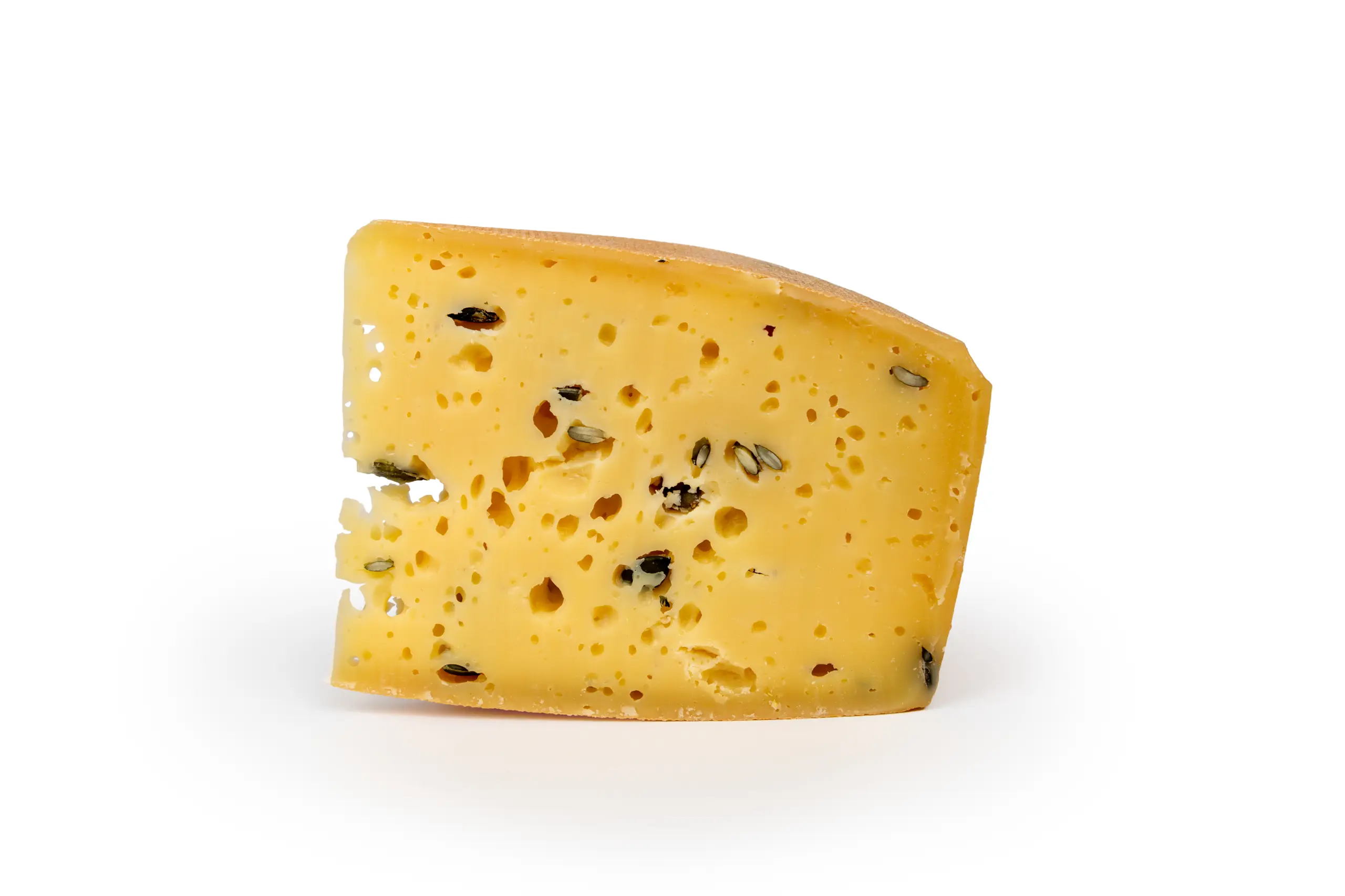 Aussehen: Außen gelblich mit Rotschmiere, innen weiß bis gelblich mit wilder Bruchlochung, verfeinert mit Tomaten- und Bärlauchstücken.